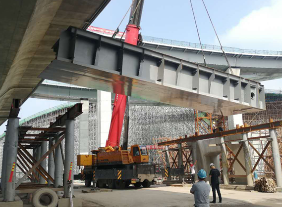 2020年5月28日 8點(diǎn)15分揚(yáng)州市目前橋梁工程中最重最長(zhǎng)的單塊鋼結(jié)構(gòu)箱梁吊裝,標(biāo)志著跨路段鋼箱梁吊裝結(jié)束。
