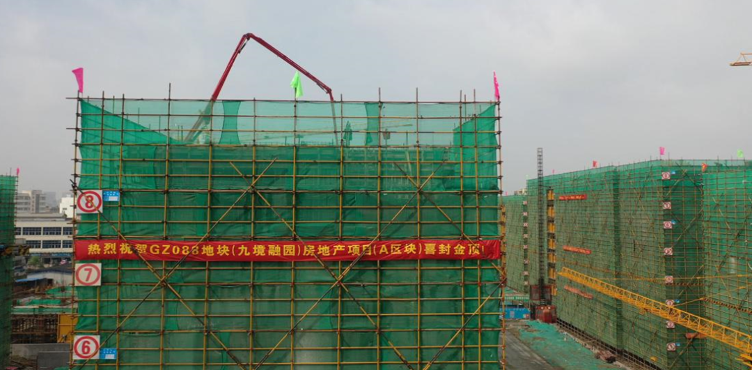 9月18日一早,九境融園項目施工現(xiàn)場萬里晴空、惠風(fēng)和暢,寫著“熱烈祝賀GZ088地塊(九境融園)房地產(chǎn)項目(A區(qū)塊)喜封金頂”字樣的橫幅格外閃耀。伴隨著3、5號樓屋面頂板混凝土澆筑,在建設(shè)單位、監(jiān)理單位及施工單位的共同見證下,九境融園項目A區(qū)塊工程正式完成全部主體結(jié)構(gòu)的封頂。