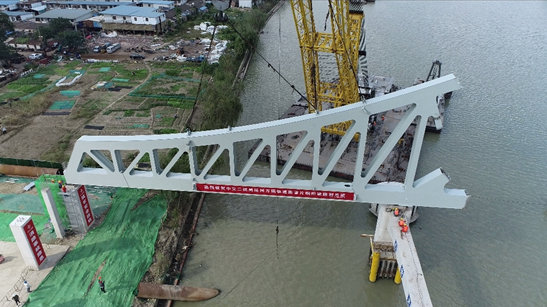 9月26日下午,萬(wàn)福快速路跨京杭運(yùn)河大橋首片鋼桁架吊裝成功,打響了大橋上部結(jié)構(gòu)施工的第一槍。