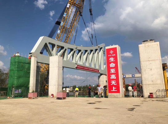 鋼桁架安裝是大橋整個(gè)施工過(guò)程中施工難度最大、技術(shù)要求最高的環(huán)節(jié),項(xiàng)目部從構(gòu)件進(jìn)場(chǎng)、吊裝、精準(zhǔn)定位,每一道工序、環(huán)節(jié)都實(shí)行全過(guò)程、無(wú)縫隙的標(biāo)準(zhǔn)化管理,全力確保安裝和細(xì)節(jié)滿足技術(shù)要求。為確保首節(jié)鋼桁架吊裝工作有序開(kāi)展,項(xiàng)目部成立了專項(xiàng)施工領(lǐng)導(dǎo)小組,多次組織召開(kāi)籌備會(huì)并進(jìn)行吊裝試驗(yàn)。由于吊裝施工是在繁忙的運(yùn)河Ⅱ級(jí)航道,航道運(yùn)輸船舶眾多,為確保航道安全,項(xiàng)目部多次與地方海事協(xié)調(diào),提前發(fā)布封航通告,吊裝過(guò)程實(shí)施水上臨時(shí)交通管制,為安全順利吊裝提供了堅(jiān)實(shí)保障。
