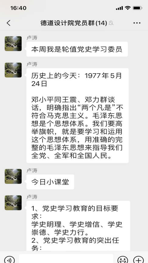 近日,為提升學史學習教育的實效性,設計院支部創(chuàng)新思路,結合工作的特殊性,以“黨員學習群”為載體,開展“輪值學習委員領學”活動,排出學習委員輪值表,支部委員帶頭,黨員跟上,每周由一名“學習委員”,帶領大家開展黨史線上學習。輪值學習委員在值班日當天利用中午時間,通過微信群,“敲黑板、劃重點”,發(fā)布“歷史上的今天”和“今日小課堂”兩個版塊的學習內(nèi)容?!皻v史上的今天”展示了中國共產(chǎn)黨和新中國成立以來重大事件?!敖袢招≌n堂”每日推送三條黨史學習教育內(nèi)容,讓支部每個黨員在靈活時間內(nèi)完成學習,汲取知識。