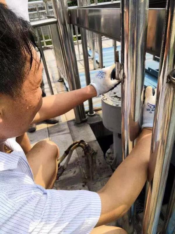 中午12點(diǎn),太陽(yáng)猛烈,揚(yáng)州第四水廠機(jī)電班李軍在沉淀池進(jìn)行設(shè)備巡檢維修,此時(shí)他曬成了“大紅臉”,汗如雨下?!懊刻煲路撓聛?lái)都能擰出水,至少要換洗2套工作服?!崩钴娦χ蛉さ?,設(shè)備維修馬虎不得,哪怕是擰緊松動(dòng)的一顆螺絲、解決一絲絲的滲油,都有可能避免一場(chǎng)安全事故?!案邷靥旃ぷ鞔_實(shí)難熬,但能確保水廠的生產(chǎn)運(yùn)轉(zhuǎn),辛苦點(diǎn)也很值得?!?/p>