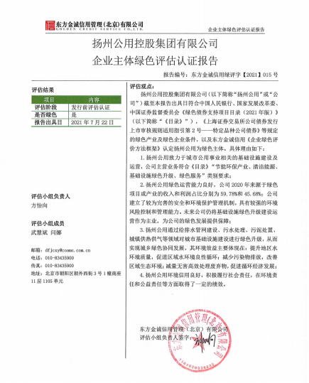 根據(jù)評估結(jié)果,東方金誠確認(rèn)揚(yáng)州公用控股的綠色業(yè)務(wù)符合國家發(fā)展改革委等七部門發(fā)布的《綠色產(chǎn)業(yè)指導(dǎo)目錄(2019年版)》和人民銀行等三部門發(fā)布的《綠色債券支持項目目錄(2021年版)》要求,公司經(jīng)營的環(huán)境表現(xiàn)、社會表現(xiàn)和公司治理的綜合綠色化程度較高。