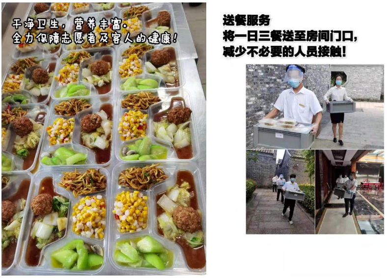 嚴(yán)控食品安全管理不越紅線。嚴(yán)格把控食品安全關(guān),建議供貨商進(jìn)行無(wú)接觸配送,每日及時(shí)清理過(guò)期變質(zhì)原料和食品;客人餐食合理搭配,營(yíng)養(yǎng)均衡,每日將三餐送至客房區(qū)域,由客人自取,用餐完畢由服務(wù)人員取走餐具進(jìn)行清洗、消毒,垃圾統(tǒng)一回收處理。