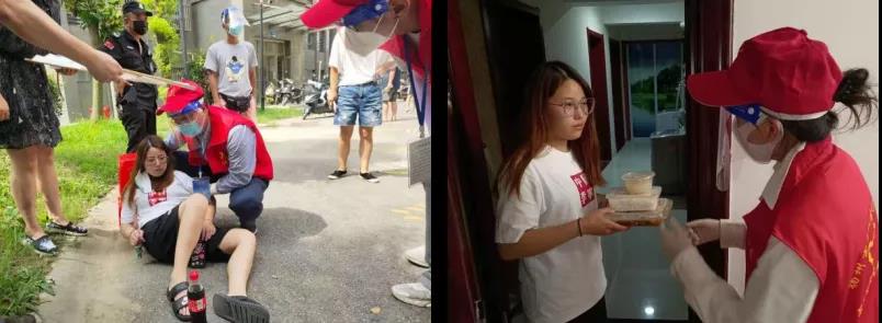 早晨的揚州,烈日灼烤。核酸檢測現(xiàn)場,志愿者們一邊維持著秩序,一邊細(xì)心觀察著隊伍中人群。突然,一位20歲左右的小姑娘踉蹌著往隊伍外走了幾步,眼看著要跌坐下來,志愿者成愛祥趕緊上前一把拉住了姑娘手臂,扶她坐下。 小姑娘臉色發(fā)白,虛弱的喘著粗氣,豆大的汗珠從臉頰滴落下來。志愿者孫卉說到:“昨天看這個小姑娘,氣色就有點不太好,今天怎么突然暈倒了”,說罷她便趕忙上前詢問狀況。小姑娘躊躇了一會,委屈的說到:“我一個人在揚州,在小區(qū)租了房子,這疫情來了,也不敢出去,小區(qū)里小賣部的東西早就賣完了,這幾天都是吃家里剩下的一些餅干。”志愿者們趕緊給小姑娘扶起來,送回家里休息。隨即,孫卉便趕緊聯(lián)系到了盒飯送到了小姑娘家中,她對小姑娘說:“一個人在揚州,不要怕,我們就是你的家人,要買什么東西,有什么困難直接和我們說?!毙」媚镅劭舴杭t的接過盒飯之后連聲道謝。關(guān)上門后,志愿者們又回到了工作一線。