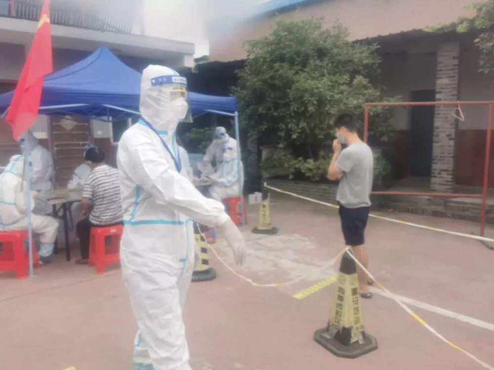 8月7日,一夜之間,揚州增加了確診患者52例,其中有20例都是發(fā)生在武塘社區(qū),武塘社區(qū)居民談“疫”色變。當(dāng)天上午,志愿服務(wù)隊負(fù)責(zé)在武塘社區(qū)四季園菜場核酸檢測點維持居民核酸檢測秩序。從早上8點開始,檢測點兩側(cè)就排起了長長的隊伍,“兩個人負(fù)責(zé)喊居民準(zhǔn)備好身份證和健康碼,其他人都去維持秩序,保持兩米距離,不能讓群眾過于聚集,動作迅速!”隊員們一邊做好檢測物資的運送,一邊迅速開展了對核酸檢測隊伍秩序維護(hù)工作。