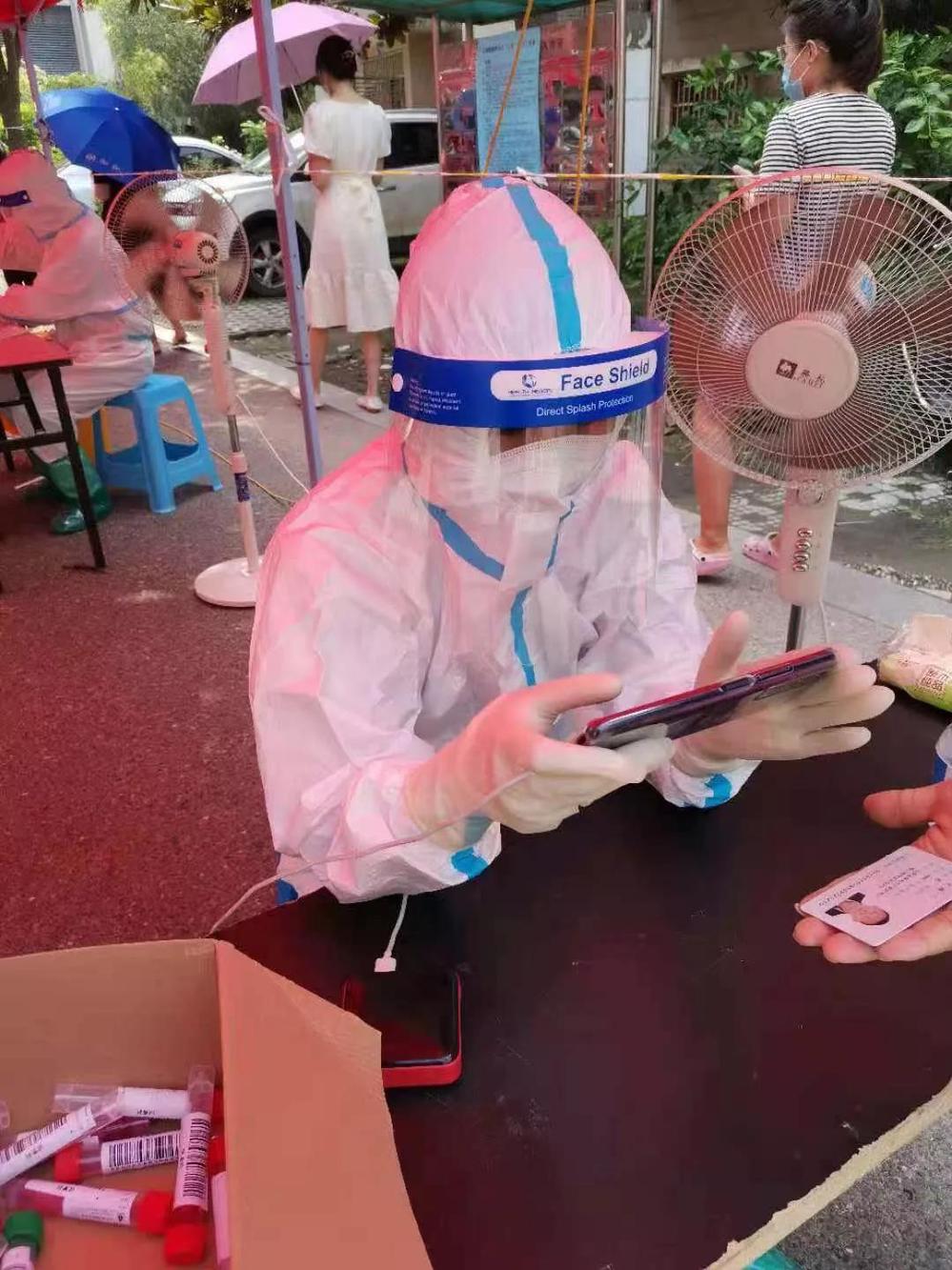 “女兒,我雖然已經(jīng)五十幾歲了,但是我還能出一份力的!”穿上紅馬甲的葛德林很自信?!鞍职郑晃荒赀^半百的人都能有這么高的覺悟,作為年輕人的我也不能掉隊(duì)呀!”葛愛婷下定決心要做好志愿服務(wù)工作,葛愛婷是供水服務(wù)大廳的收費(fèi)員,平時(shí)與數(shù)字?jǐn)?shù)據(jù)打交道比較多,于是她成了核酸檢測(cè)數(shù)據(jù)信息采錄人員。她把年紀(jì)尚小的兩個(gè)小孩都丟給家人照顧,在經(jīng)過疫情防控知識(shí)培訓(xùn)后,每天穿上密不透風(fēng)的防護(hù)服,戴上防護(hù)面罩和手套,成了一名“大白”,負(fù)責(zé)核酸檢測(cè)人員信息采樣登記。驗(yàn)碼、掃描、錄入數(shù)據(jù)……每次核酸檢測(cè)時(shí),這樣的勞動(dòng)數(shù)以萬次,每次她都一絲不茍,深怕出現(xiàn)差錯(cuò),影響檢測(cè)結(jié)果。每天工作十幾個(gè)小時(shí),經(jīng)歷高溫酷暑,渾身濕透毫無怨言。