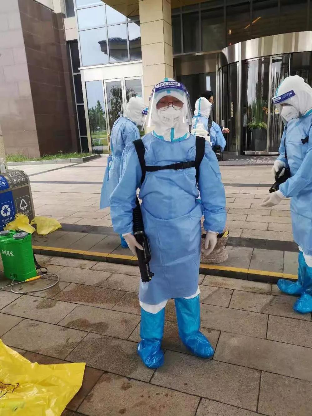 (湯汪污水處理廠朱彥凱全副武裝,在皇冠假日酒店參加消毒工作,汗水早已濕透了他的衣服)