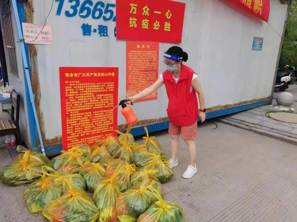 (水質(zhì)檢測中心吳靖在徐凝門社區(qū)為居民平價菜品進(jìn)行外包裝消毒,并做好居民勸導(dǎo)工作)