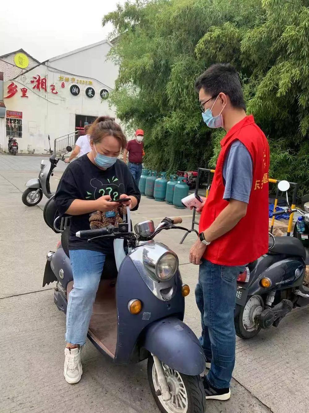(六圩廠劉佳曦在徐凝門社區(qū)羊胡巷卡口勸導(dǎo)居民不出行,對必要出行者測溫登記后查驗工作通行證和蘇康碼)