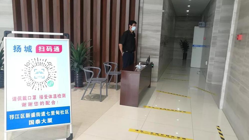 接到可以辦理復(fù)工復(fù)產(chǎn)的通知后,國泰物管處一邊迅速按照屬地防疫指揮部要求,制定了疫情防控預(yù)案,并完成資料申報;一邊抓緊對大廈進行了一系列防控措施的現(xiàn)場部署。9月4日,現(xiàn)場完成了5臺“揚城掃碼通”一體機的安裝,在各出入口張貼了二維碼,同時做好出入口防控崗人員的崗前培訓(xùn),尤其是熟練掌握一體機的使用和故障排查培訓(xùn),以便保障有序通行;9月5日上午,關(guān)停地下車庫電梯,完成通道導(dǎo)行標(biāo)識張貼,同時根據(jù)反復(fù)規(guī)劃的合理線路,除預(yù)留的2個消防通道外,其余出入口全部封閉;9月5日下午,完成地面一米線布設(shè),為有序掃碼和乘坐電梯做好準(zhǔn)備。疫情防控期間,所有進入大廈的工作人員需按照指引,從規(guī)定入口和通道通行,并需經(jīng)過“揚城掃碼通”、現(xiàn)場登記、自動測溫三道關(guān),才能進入大廈內(nèi)。