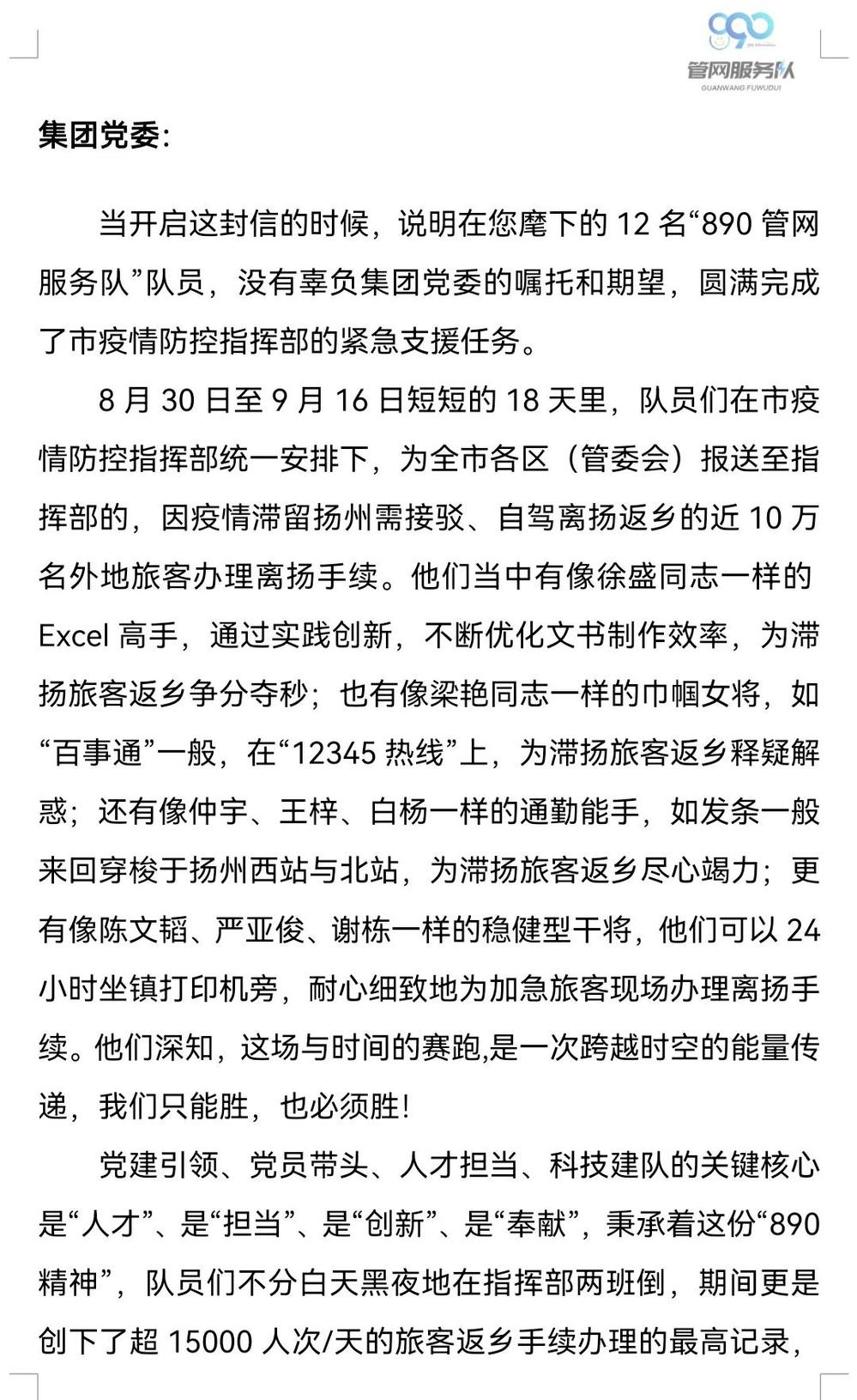 志愿服務(wù)工作結(jié)束后,這12名敬業(yè)而又可愛的志愿者將18天來工作的點(diǎn)點(diǎn)滴滴匯聚成了一封匯報(bào)信,向集團(tuán)黨委匯報(bào)他們不辱使命,用實(shí)際行動(dòng)踐行了“守城衛(wèi)家、城控有我”的鏗鏘誓言,并請集團(tuán)黨委放心,他們將把抗疫精神繼續(xù)延續(xù)到今后的工作中,讓890管網(wǎng)服務(wù)隊(duì)成為民生服務(wù)的金字招牌。