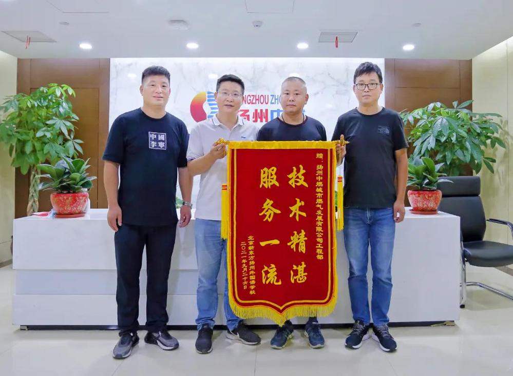 9月28日上午,新東方揚(yáng)州外國(guó)語學(xué)校中學(xué)部膳食中心主任高乃軍一行來到揚(yáng)州中燃,向公司贈(zèng)送了一面“技術(shù)精湛,服務(wù)一流”錦旗,以表達(dá)對(duì)揚(yáng)州中燃公司克服諸多困難,保障學(xué)校師生安全用氣的感激之情。