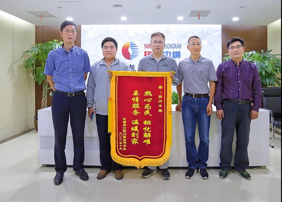 10月11日下午,揚(yáng)州天瑞府22、23幢的業(yè)主代表來到揚(yáng)州中燃公司,送上了一面“熱心為民、排憂解難,親情服務(wù)、溫暖到家”錦旗,以表達(dá)對揚(yáng)州中燃公司為民辦實(shí)事的感激之情,讓業(yè)主感受到了春天般的溫暖。