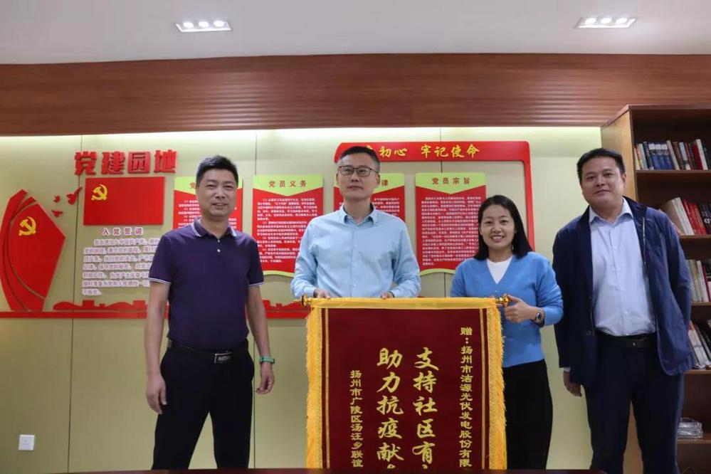 10月13日上午,廣陵區(qū)湯汪鄉(xiāng)聯(lián)誼南園社區(qū)將一面印有“支持社區(qū)有大愛(ài),助力抗疫獻(xiàn)真情”的錦旗送到光伏公司,對(duì)光伏公司為社區(qū)辦實(shí)事、解難題的真誠(chéng)服務(wù)表示感謝。