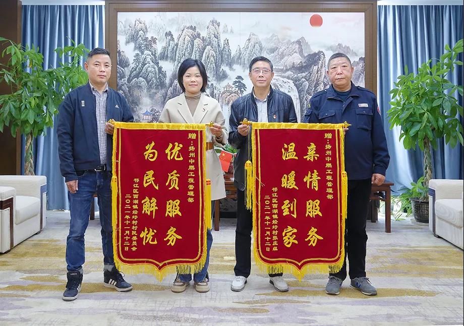 11月16日,邗江區(qū)西湖鎮(zhèn)經(jīng)圩村村委會、經(jīng)圩村張莊組代表來到揚州中燃公司,送來印有“優(yōu)質(zhì)服務(wù)、為民解憂”“親情服務(wù)、溫暖到家”兩面錦旗,以表達對公司在施工過程中想方設(shè)法、協(xié)調(diào)矛盾、規(guī)范高效、為民解憂的誠摯感謝。