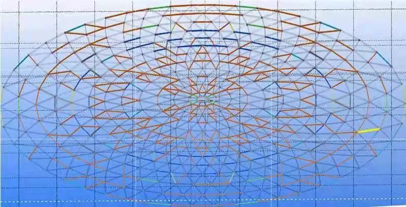 該鋼結構穹頂屬于網殼結構,由鋼管桿件構成68個單元模塊,四周環(huán)繞12個樹狀結構支撐,自重約440t,呈橢圓型,長軸92m,短軸51m。
