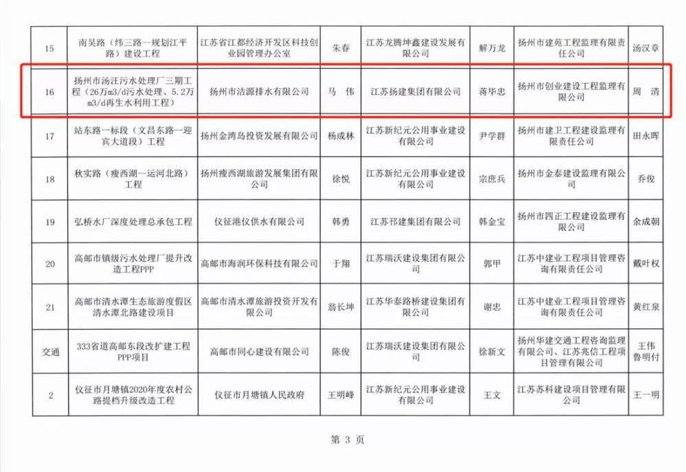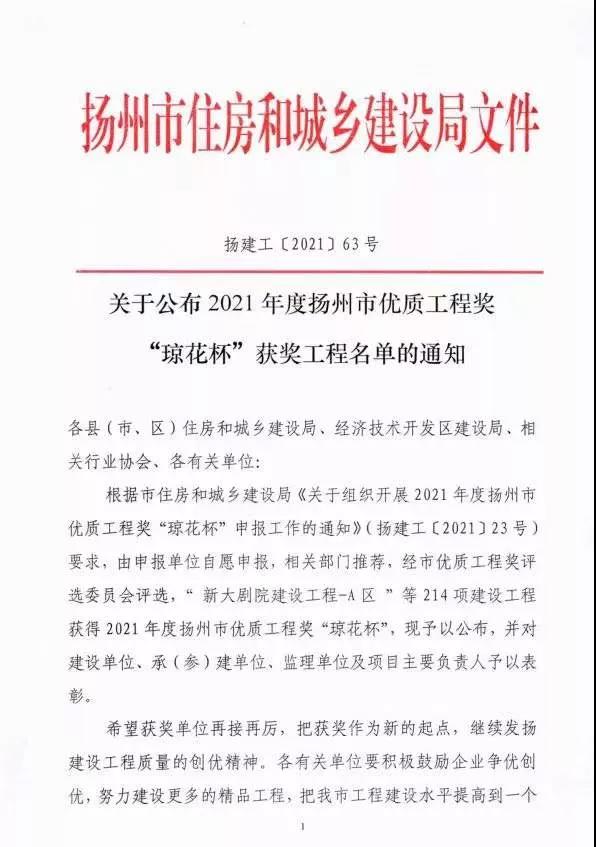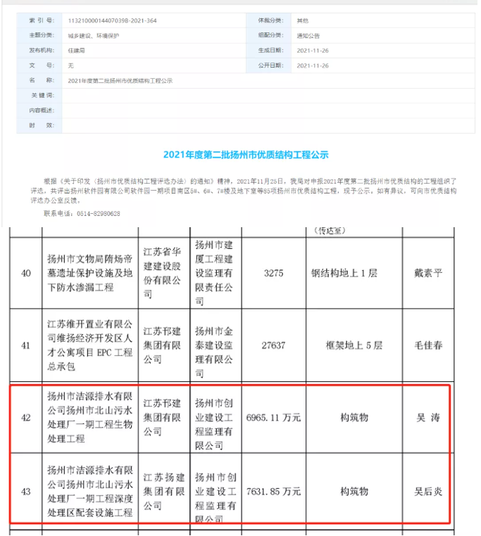 2021年底,揚州市優(yōu)質(zhì)工程獎“瓊花杯”獲獎工程名單揭曉,揚州市湯汪污水處理廠三期工程(26萬噸/日污水處理、5.2萬噸/日再生水利用工程)榮獲2021年度“瓊花杯”市政類優(yōu)質(zhì)工程獎。同時,湯汪三期尾水管線工程、北山一期工程生物處理區(qū)工程、北山一期深度處理區(qū)及配套設(shè)施工程、北山一期尾水管線工程,4個項目均獲市文明工地稱號;北山一期工程生物處理區(qū)工程、北山一期深度處理區(qū)及配套設(shè)施工程,2個項目榮獲市優(yōu)質(zhì)結(jié)構(gòu)。