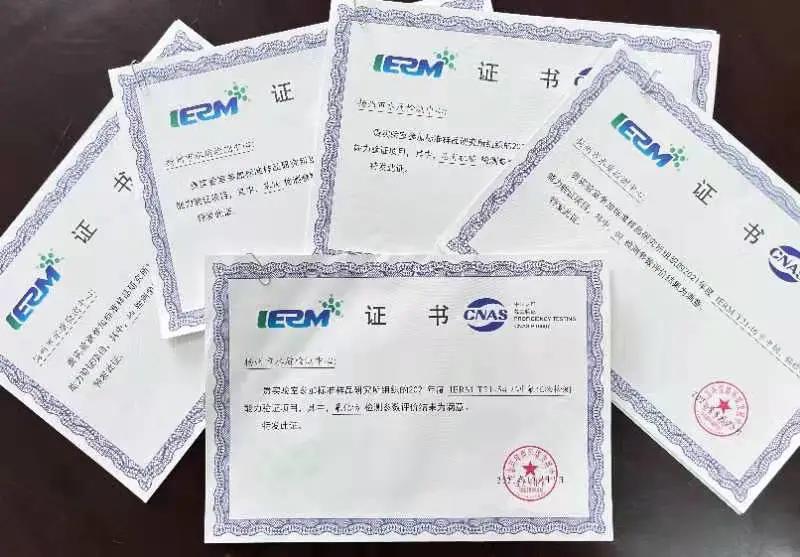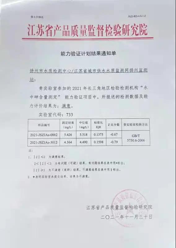 能力驗(yàn)證是國家認(rèn)監(jiān)委考核CMA實(shí)驗(yàn)室檢測能力的主要方法,通過發(fā)放盲樣考核各級實(shí)驗(yàn)室檢測人員的檢測技能水平,能夠?qū)嵤虑笫堑胤从硨?shí)驗(yàn)室的檢測能力。2021年,水質(zhì)檢測中心通過國家生態(tài)環(huán)境部實(shí)驗(yàn)室能力驗(yàn)證,獲得氟化物等項(xiàng)目檢測滿意證書;通過江蘇省產(chǎn)品質(zhì)量監(jiān)督檢驗(yàn)研究院組織的“長三角地區(qū)檢驗(yàn)檢測機(jī)構(gòu)”水質(zhì)檢測能力驗(yàn)證,也獲得項(xiàng)目檢測滿意證書。