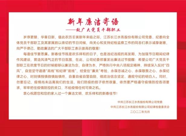 為認(rèn)真貫徹落實(shí)城控集團(tuán)紀(jì)委《關(guān)于進(jìn)一步加強(qiáng)春節(jié)期間紀(jì)律作風(fēng)建設(shè)的通知》要求,持續(xù)推進(jìn)中央八項(xiàng)規(guī)定精神及其實(shí)施細(xì)則落地生根,嚴(yán)防“四風(fēng)”問題反彈回潮,提醒黨員干部職工廉潔過節(jié)。春節(jié)前夕,長(zhǎng)江水務(wù)公司紀(jì)委精心制作了100余份“新春廉潔卡”,向公司領(lǐng)導(dǎo)班子、各部門負(fù)責(zé)人及部分黨員干部職工送去了廉潔提醒和節(jié)日祝福,提醒大家把好節(jié)日廉潔“第一關(guān)口”,營(yíng)造廉潔文明、歡樂祥和的節(jié)日氛圍。