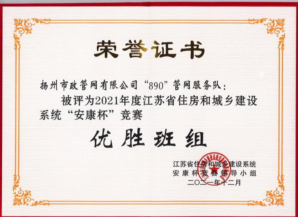 “安全壓倒一切,健康高于一切?!痹?021年度江蘇省住房和城鄉(xiāng)建設(shè)系統(tǒng) “安康杯”競(jìng)賽活動(dòng)中,管網(wǎng)公司“890”管網(wǎng)服務(wù)隊(duì)榮獲“安康杯”競(jìng)賽優(yōu)勝班組榮譽(yù)稱(chēng)號(hào)。