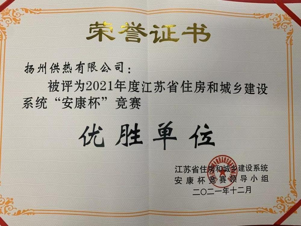 近日,在2021年度江蘇省住房和城鄉(xiāng)建設(shè)系統(tǒng) “安康杯”競(jìng)賽活動(dòng)中,供熱公司榮獲“安康杯”競(jìng)賽優(yōu)勝單位榮譽(yù)稱(chēng)號(hào)。