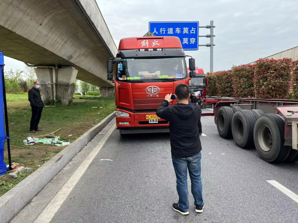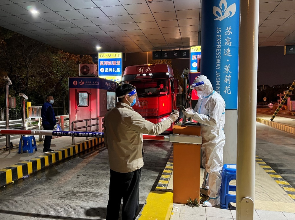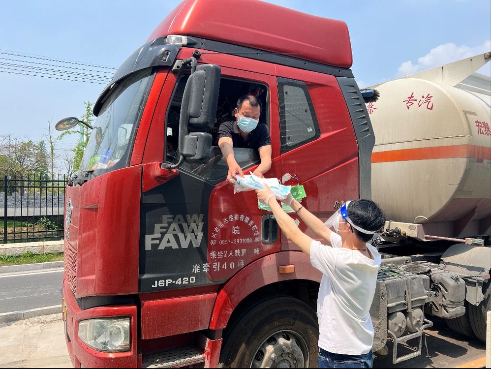 (生產(chǎn)運行處董石語,在湯汪高速口接駁藥劑運輸車輛,向查驗點工作人員出示電子通行證)