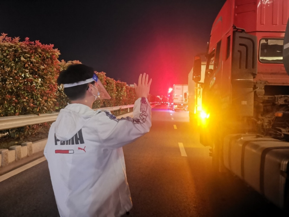 (總工程師辦公室黃肖輝,夜深時分在湯汪高速口送完最后一輛車,履行來揚返揚貨車駕乘人員全過程閉環(huán)管理工作職責)
