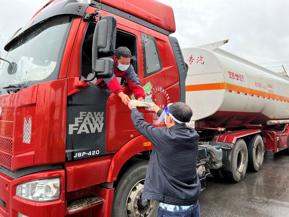 (生產(chǎn)運行處王志剛,給藥劑司機送上熱騰騰的飯菜,嚴格落實疫情防控主體責任做到食宿有人管)