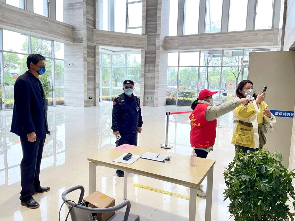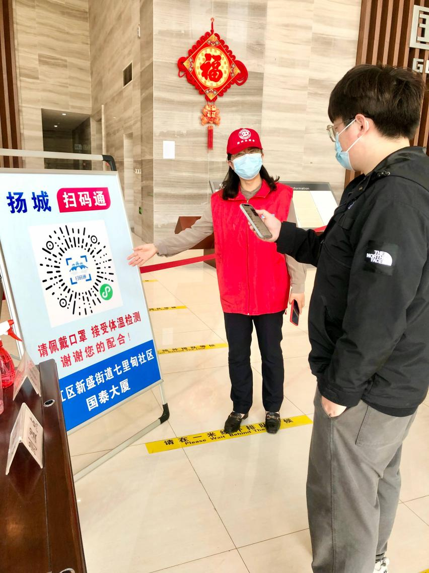 根據(jù)統(tǒng)一安排,每天會有2組志愿者,同時于每天人流量較大的8:30—9:30和12:00—13:00兩個時間段,分別在國泰大廈兩棟樓的入戶大廳內(nèi),協(xié)助國泰大廈安保人員對來往業(yè)主開展體溫測量、“三碼”核查、信息登記等疫情防控工作。