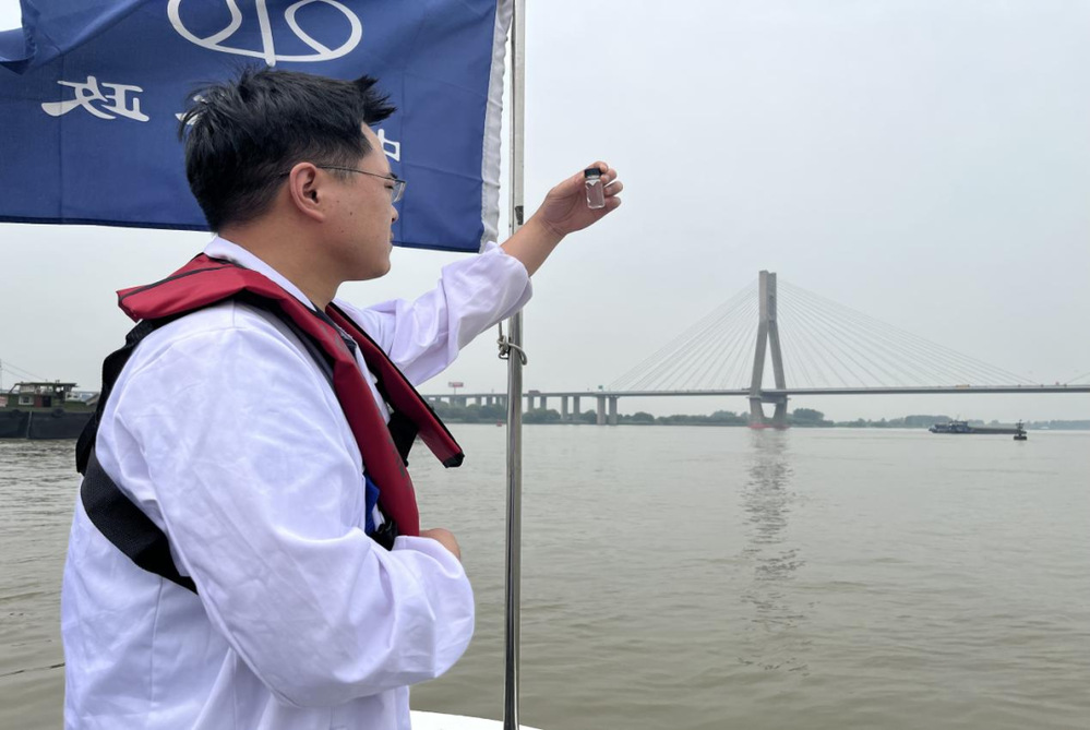 在瓜洲取水口的江面上,公司水質(zhì)檢測中心工作人員現(xiàn)場采集了水質(zhì)樣本,并進(jìn)行濁度、含氧量等指標(biāo)初期化驗(yàn),指標(biāo)均為合格。