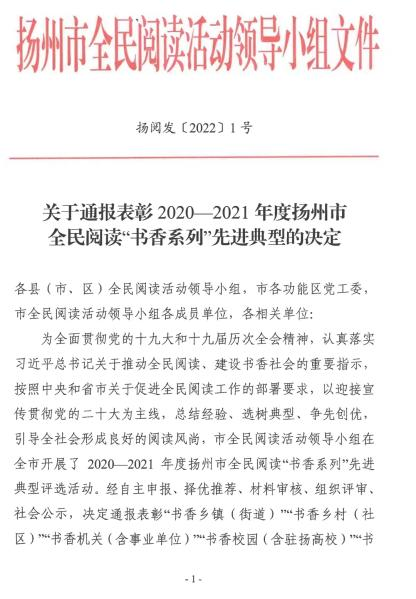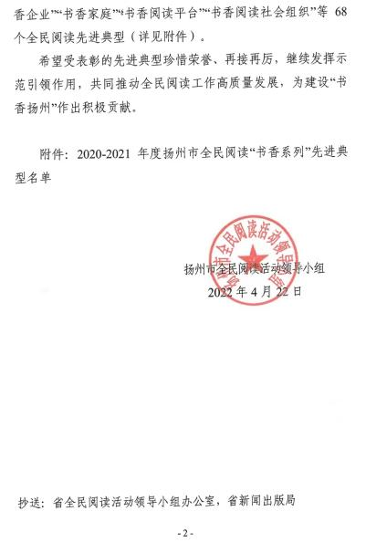 近日,2020—2021年度揚(yáng)州市全民閱讀“書香系列”先進(jìn)典型名單公布,長(zhǎng)江水務(wù)公司經(jīng)過(guò)自主申報(bào)、擇優(yōu)推薦、材料審核、組織評(píng)審、社會(huì)公示等考核環(huán)節(jié)后,在市內(nèi)眾多企業(yè)中脫穎而出,喜獲“揚(yáng)州市書香企業(yè)”稱號(hào)。