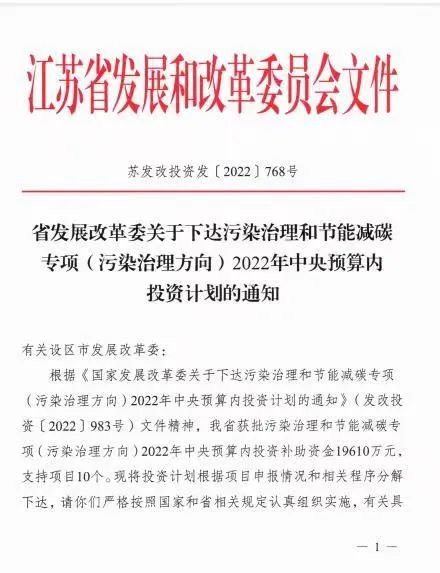 近日,中法環(huán)境收到江蘇省發(fā)展和改革委員會下發(fā)的《關于轉發(fā)下達污染治理和節(jié)能減碳專項(污染治理方向)2022年中央預算內(nèi)投資計劃的通知》(發(fā)改投資【2022】983號),中法環(huán)境污泥處置及資源化利用二期項目獲得中央預算內(nèi)投資補助資金2000萬元(占投資總額16%)。