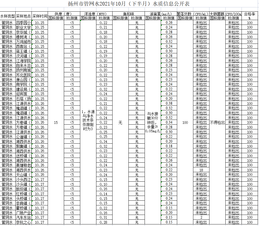 揚州市管網(wǎng)水2021年10月(下半月)水質(zhì)信息公開表