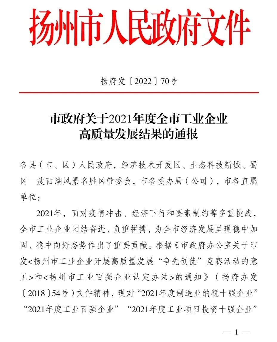 近日,揚(yáng)州市人民政府以《市政府關(guān)于2021年度全市工業(yè)企業(yè)高質(zhì)量發(fā)展結(jié)果的通報》(揚(yáng)府發(fā)[2022]70號文件),公布全市“2021年度工業(yè)百強(qiáng)企業(yè)”名單,長江水務(wù)公司名列百強(qiáng)榜單。