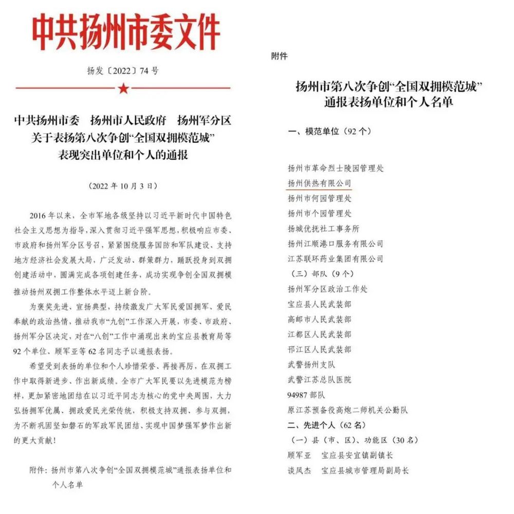 近日,揚(yáng)州市市委、市政府、軍分區(qū)印發(fā)表彰決定,揚(yáng)州供熱有限公司榮獲第八次爭創(chuàng)“全國雙擁模范城”表現(xiàn)突出單位。供熱公司始終把雙擁工作當(dāng)作新時(shí)期凝聚軍心民心、加快經(jīng)濟(jì)發(fā)展的一項(xiàng)重要工作來落實(shí),求真務(wù)實(shí),開拓創(chuàng)新,為我市成功實(shí)現(xiàn)爭創(chuàng)全國雙擁模范城“八連冠”目標(biāo)奠定了堅(jiān)實(shí)的基礎(chǔ)。