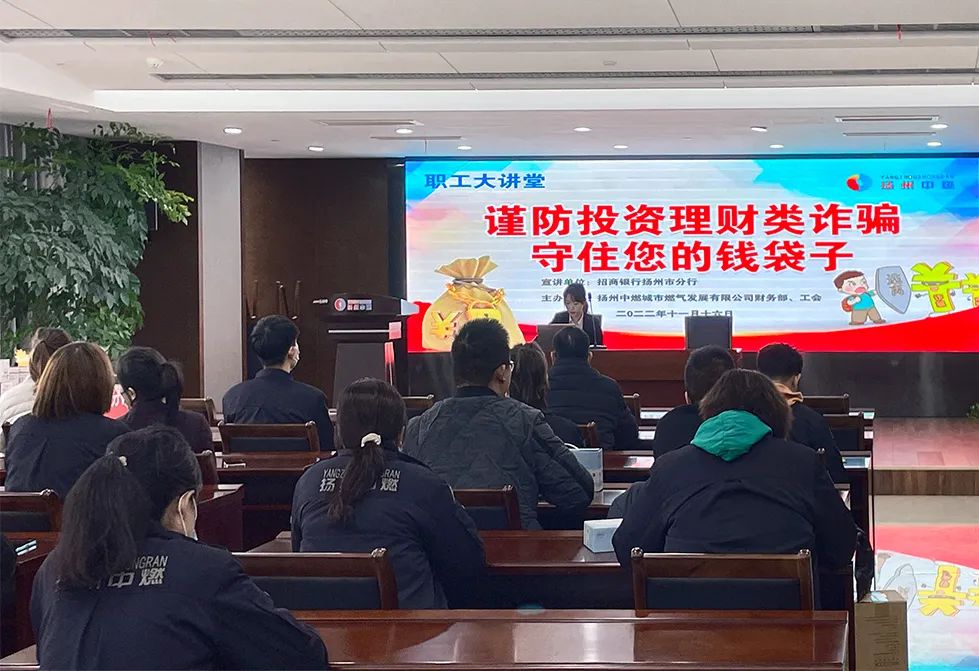 為進(jìn)一步增強(qiáng)干部員工法治意識(shí)和識(shí)騙防騙能力,2022年11月16日下午,揚(yáng)州中燃公司聯(lián)合招商銀行揚(yáng)州分行開展“謹(jǐn)防投資理財(cái)類詐騙”主題普法宣講活動(dòng)。