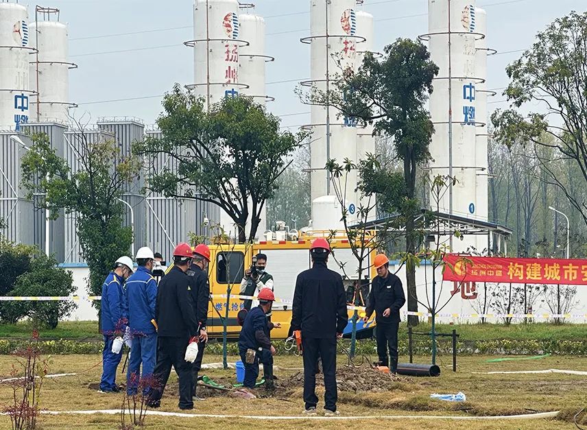 演練模擬楊廟LNG儲備站站外埋地NG壓力管道被第三方施工時破壞,造成燃?xì)庑孤┮鸹鹎?。施工人員立即向揚州中燃公司客服熱線報警,揚州中燃公司接報后通知搶修人員趕赴現(xiàn)場,同時向110報警請求支援。揚州中燃公司搶修人員到達(dá)現(xiàn)場第一時間實施警戒,進(jìn)行先期處置,并將現(xiàn)場情況逐級向企業(yè)主要負(fù)責(zé)人匯報。企業(yè)主要負(fù)責(zé)人立即啟動應(yīng)急預(yù)案一級響應(yīng)并趕赴現(xiàn)場,同時向揚州市應(yīng)急、住建、市場監(jiān)管等部門報告現(xiàn)場情況。