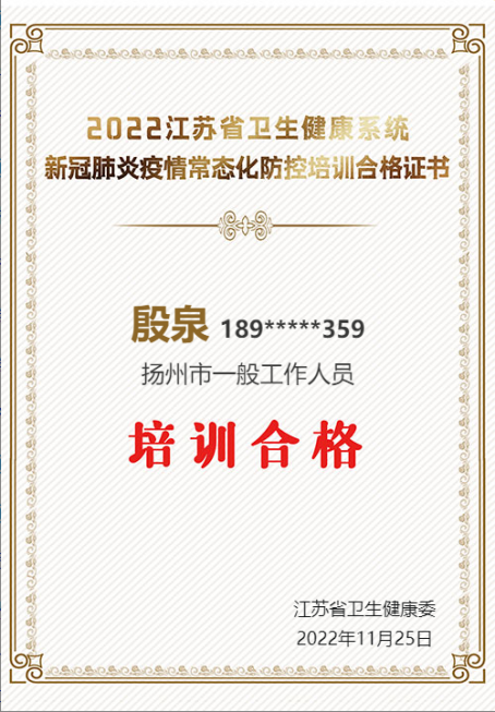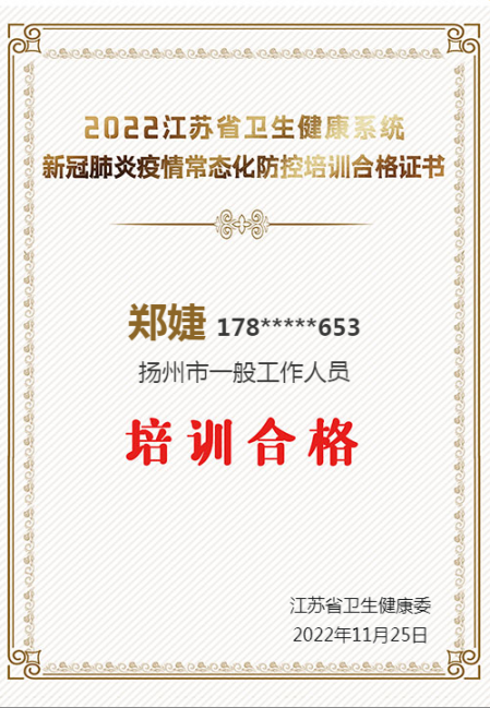 培訓會上,與會人員共同觀看了“江蘇省常態(tài)化疫情防控培訓平臺”上對《江蘇省優(yōu)化新冠肺炎疫情防控措施科學精準做好防控工作實施方案》的解讀,會議強調了對疫情防控期間辦公場地和營業(yè)廳的管理要求,從人員管理、門禁管理、物資和后勤保障工作、核酸檢測和中高風險區(qū)域排查上報管理以及通風、消毒等方面進行了解讀,希望大家高度重視此次培訓,提高對近期疫情防控工作的重要認識。集中學習后,全體職工利用休息時間登錄“江蘇省常態(tài)化疫情防控平臺”進行學習,均已獲得培訓合格證書。