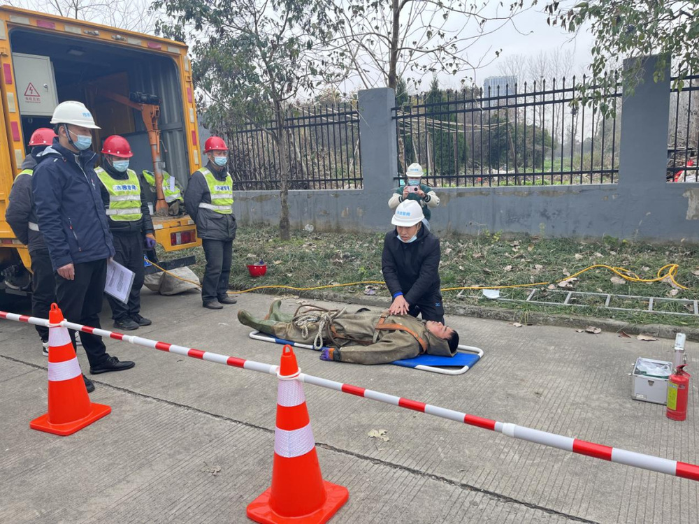 本次演練模擬作業(yè)前,現(xiàn)場指揮強(qiáng)調(diào):要嚴(yán)格落實(shí)有限空間作業(yè)規(guī)范操作,按照操作規(guī)程,遵守“先通風(fēng)、再檢測、后作業(yè)”原則,穿戴“五點(diǎn)式”安全帶、系安全繩、腰佩空氣檢測器下井作業(yè),現(xiàn)場負(fù)責(zé)人、監(jiān)護(hù)人員在作業(yè)井上方對其進(jìn)行現(xiàn)場監(jiān)管。檢測人員對污水井內(nèi)氣體進(jìn)行實(shí)時監(jiān)測,確認(rèn)井下安全。