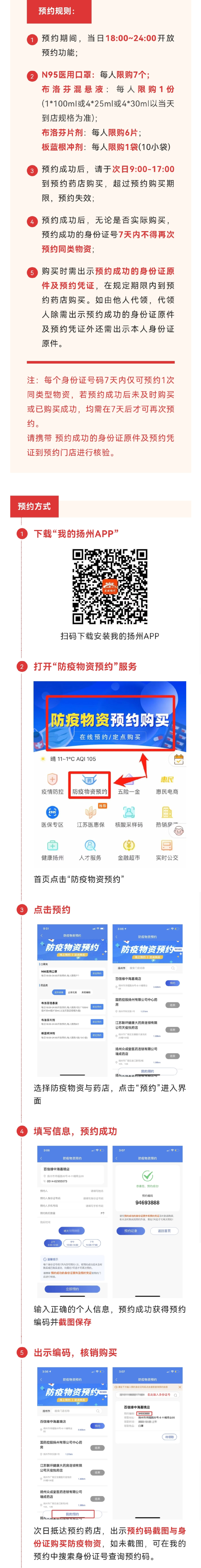 目前,揚州市民可通過“我的揚州APP”首頁“防疫物資預約購買”服務進行線上預約,線下核銷購買布洛芬、N95口罩、板藍根等防疫物資,同時也請廣大市民朋友根據需要預約購買,勿囤藥,莫恐慌,把藥品留給更有需要的人。