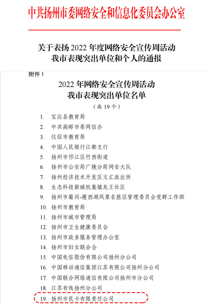 1月9日,揚州市民卡公司被揚州市委網(wǎng)信辦評為2022 年度網(wǎng)絡安全宣傳周活動“ 表現(xiàn)突出單位”。