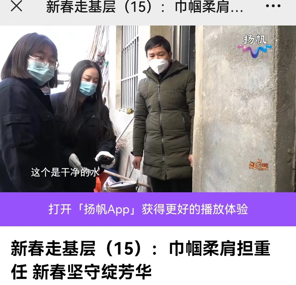 近日,家住楊廟村中林組的一位戴師傅給揚(yáng)州電視臺打電話,希望電視臺幫他表揚(yáng)長江水務(wù)江源黨支部“561”供水服務(wù)隊(duì)。揚(yáng)州電視臺“新春走基層”欄目組對此事進(jìn)行了采訪報(bào)道,攝制了《巾幗柔肩擔(dān)重任 新春堅(jiān)守綻芳華》專題片,反映了“561”供水服務(wù)隊(duì)傾情服務(wù)用戶,無懼嚴(yán)寒守護(hù)居民安全用水的敬業(yè)奉獻(xiàn)精神。
