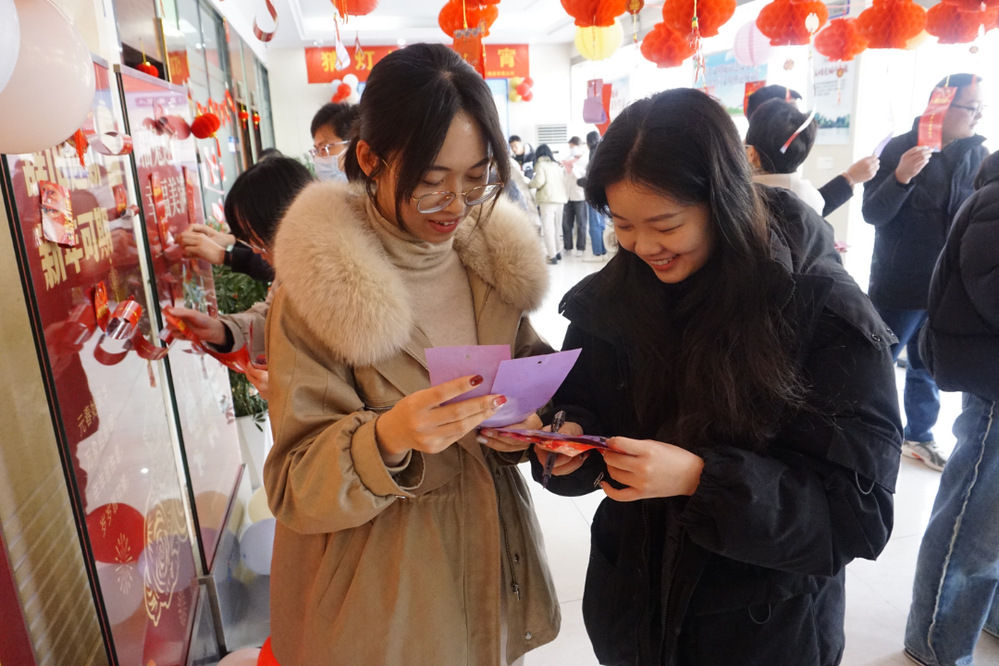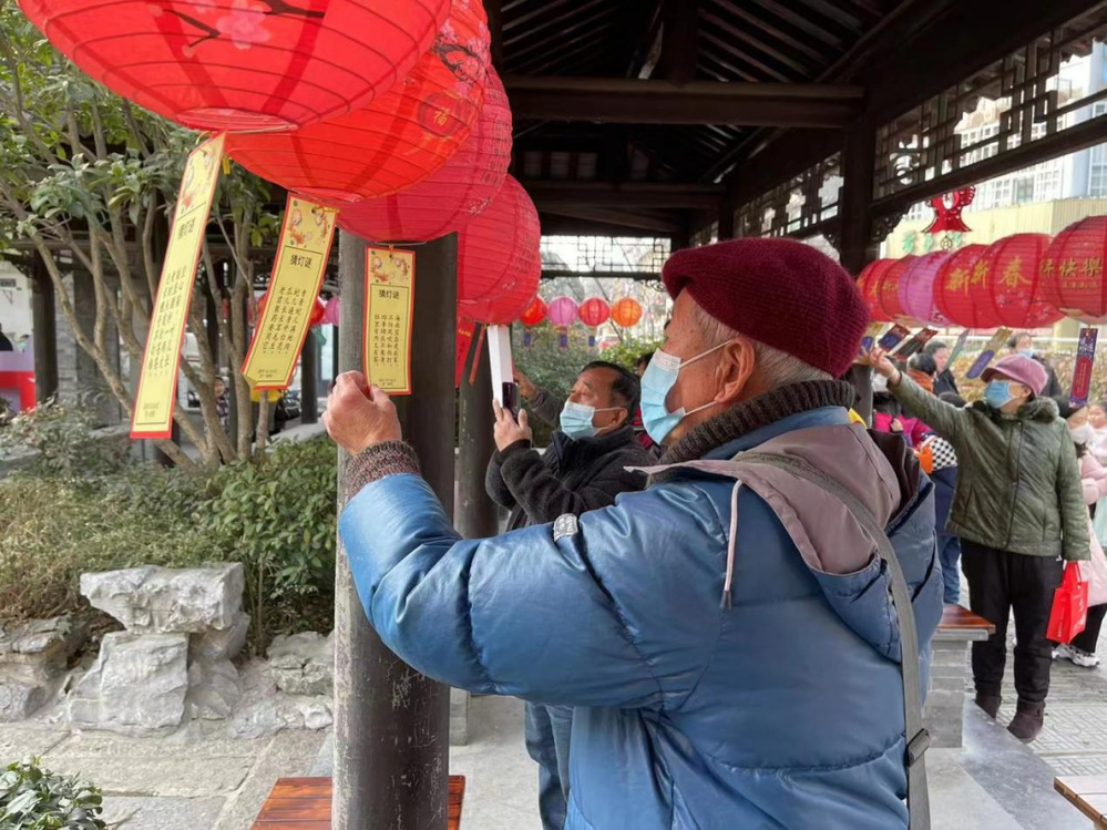 猜燈謎是元宵節(jié)不可缺少的環(huán)節(jié)?;顒?dòng)現(xiàn)場(chǎng),一排排彩紙燈謎隨風(fēng)飄揚(yáng),參與者認(rèn)真討論,沉著思考,爭(zhēng)做最強(qiáng)大腦。