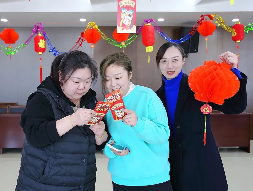 活動(dòng)現(xiàn)場(chǎng)布置的喜慶熱鬧,一盞盞火紅的燈籠懸掛在大廳,一張張“燒腦”的燈謎垂墜燈籠之下,大家站立在燈籠邊,或獨(dú)自凝神思考,或三五成群小聲討論,場(chǎng)面十分活躍,構(gòu)成了一幅歡樂(lè)祥和的畫(huà)面。兌獎(jiǎng)現(xiàn)場(chǎng)更是排成了長(zhǎng)龍,大家憑猜出的謎面,興高采烈在領(lǐng)獎(jiǎng)處兌換了獎(jiǎng)品。