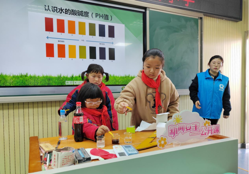 隨后,志愿者根據(jù)水的酸堿度這一知識(shí)點(diǎn),鼓勵(lì)同學(xué)們親自走上講臺(tái)動(dòng)手做實(shí)驗(yàn),分別用試紙測(cè)試自來(lái)水、飲料、肥皂水的酸堿度并作對(duì)比,既增加了課堂趣味性,也鞏固了課堂所授知識(shí)點(diǎn)。