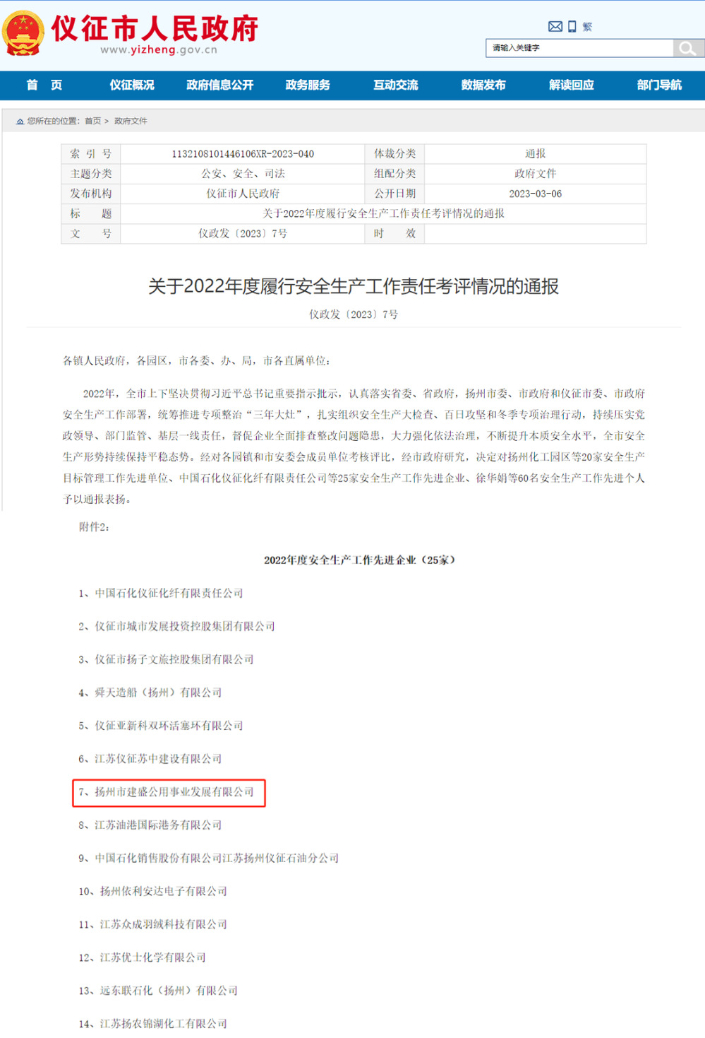 近日,儀征市人民政府通報(bào)了2022年度履行安全生產(chǎn)工作責(zé)任考評(píng)情況,建盛公司榮獲2022年度安全生產(chǎn)工作先進(jìn)企業(yè)。