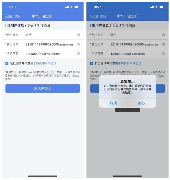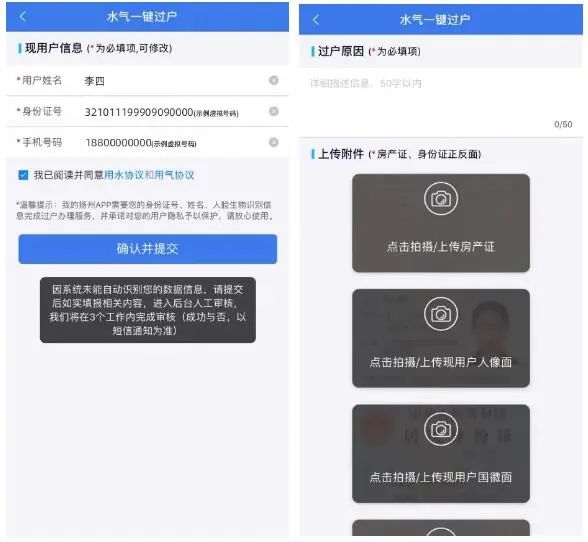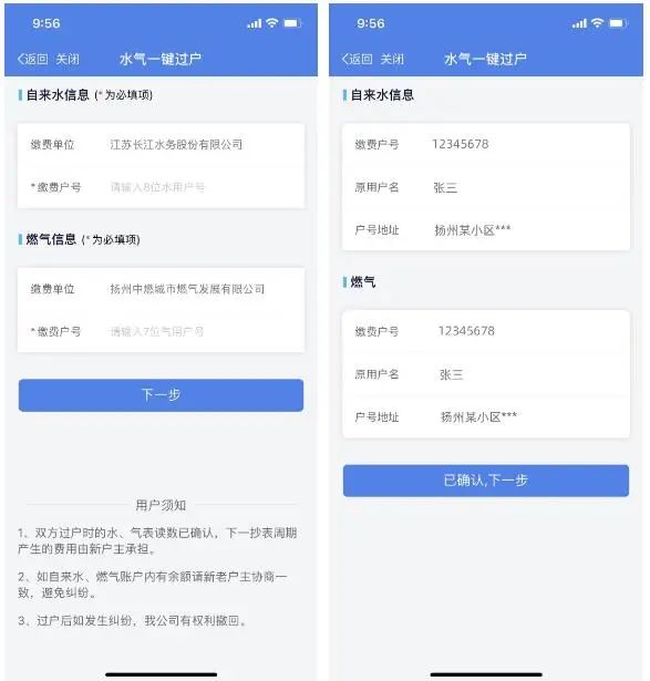 用戶只需通過“我的揚州APP”,一次性提交水氣戶號,與新戶主相關(guān)身份信息,即可在線辦理水氣過戶,整個過程高效便捷,一氣呵成,秒速辦理。