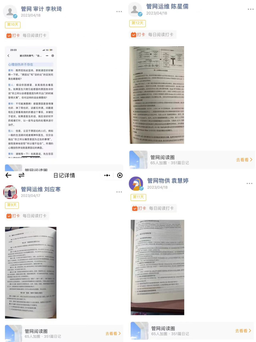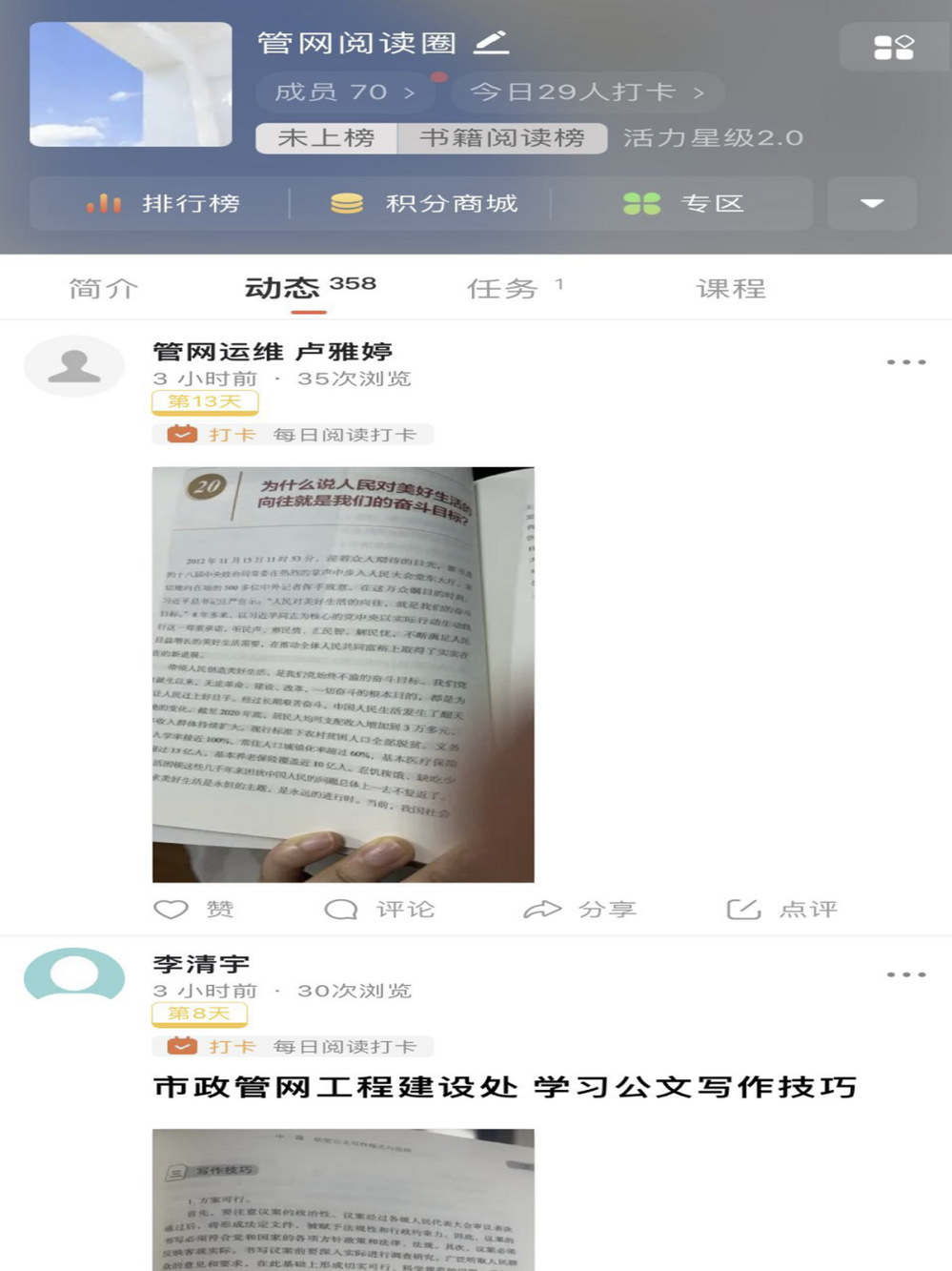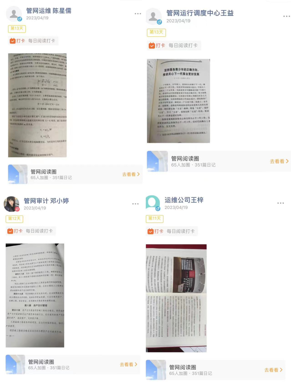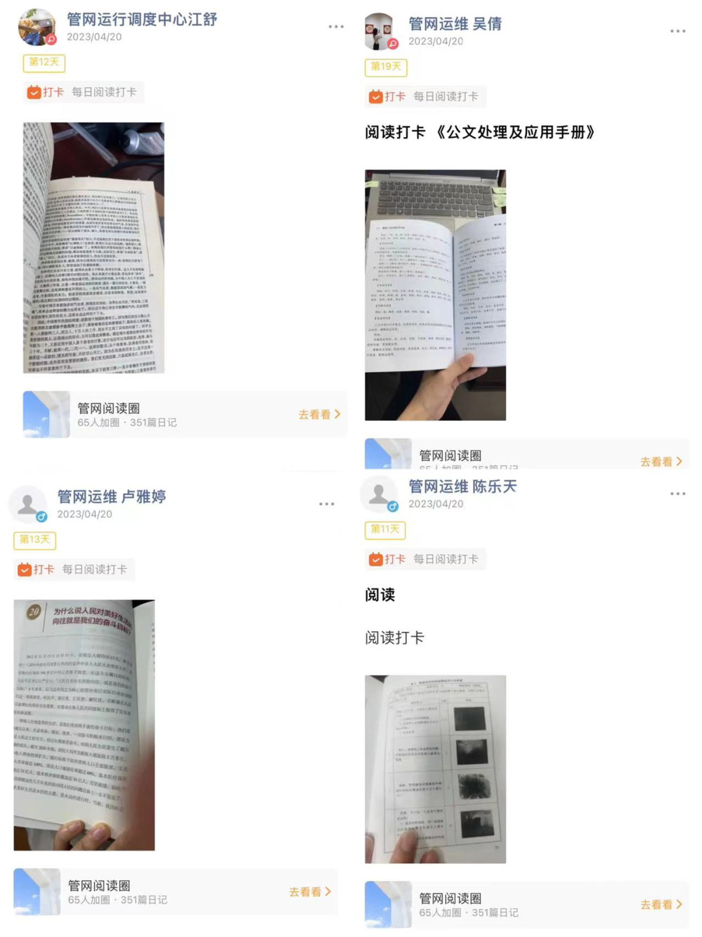 活動(dòng)開展以來,各部門積極響應(yīng),職工利用工作之余每日?qǐng)?jiān)持打卡,有的分享生產(chǎn)技術(shù)專業(yè)知識(shí),有的分享詩詞經(jīng)典,有的分享名人著作,通過積極分享發(fā)表讀書感悟,互相點(diǎn)贊鼓勵(lì),營造了“比學(xué)趕超”良好學(xué)習(xí)氛圍。