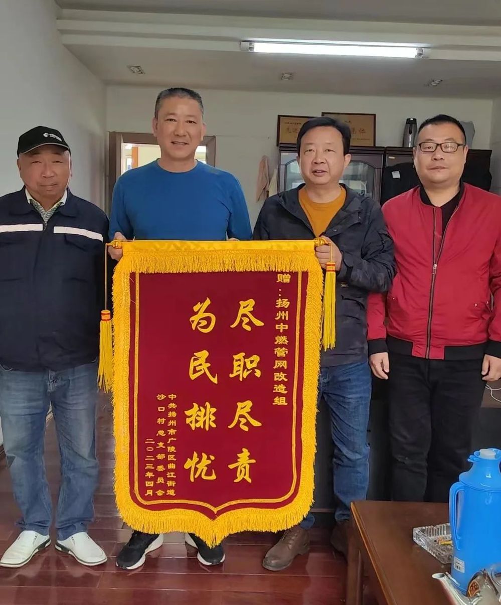 2023年4月23日,曲江街道沙口村總支部代表來到揚(yáng)州中燃公司,贈(zèng)送了一面“盡職盡責(zé),為民排憂”的錦旗,以表達(dá)對(duì)燃?xì)夤艿栏脑焓┕と藛T在沙口村老舊燃?xì)夤艿栏脑熘袩o“微”不至、專業(yè)周到的貼心服務(wù)表示感謝!